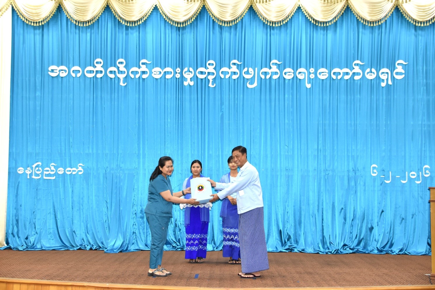 ကော်မရှင်ဥက္ကဋ္ဌ ဦးလွင်ဦး က နေပြည်တော်ပြည်သူ့ဆေးရုံကြီး (ခုတင်-၁၀၀၀)မှ အထူးကုဆရာဝန်ကြီးတစ်ဦးအား ကော်မရှင်အမှတ်တံဆိပ်ပါ လက်ဆောင်ပစွည်းများ ပေးအပ်ခြင်း