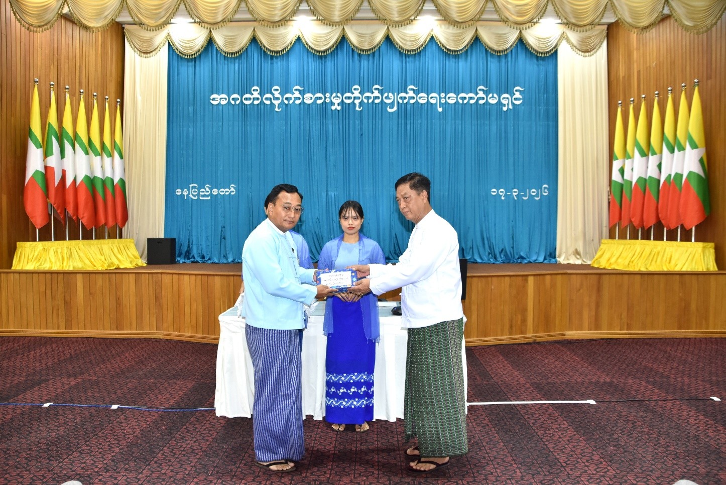 ကော်မရှင်ဥက္ကဋ္ဌ ဦးလွင်ဦး က စီမံရေးရာဦးစီးဌာနမှ အမှုထမ်းဝန်ထမ်းများအတွက် ထောက်ပံ့ငွေများကို ညွှန်ကြားရေးမှူးချုပ် ဦးလွင်အောင် အား ပေးအပ်ခြင်း