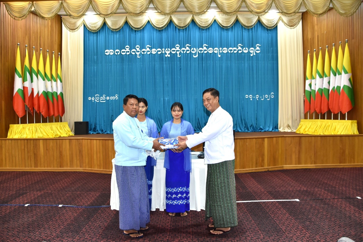 ကော်မရှင်ဥက္ကဋ္ဌ ဦးလွင်ဦး က နိုင်ငံတကာရေးရာနှင့် တားဆီးကာကွယ်ရေးဦးစီးဌာနမှ အမှုထမ်းဝန်ထမ်းများအတွက် ထောက်ပံ့ငွေများကို ညွှန်ကြားရေးမှူးချုပ် ဦးကောင်းဇော်သန့် အား ပေးအပ်ခြင်း