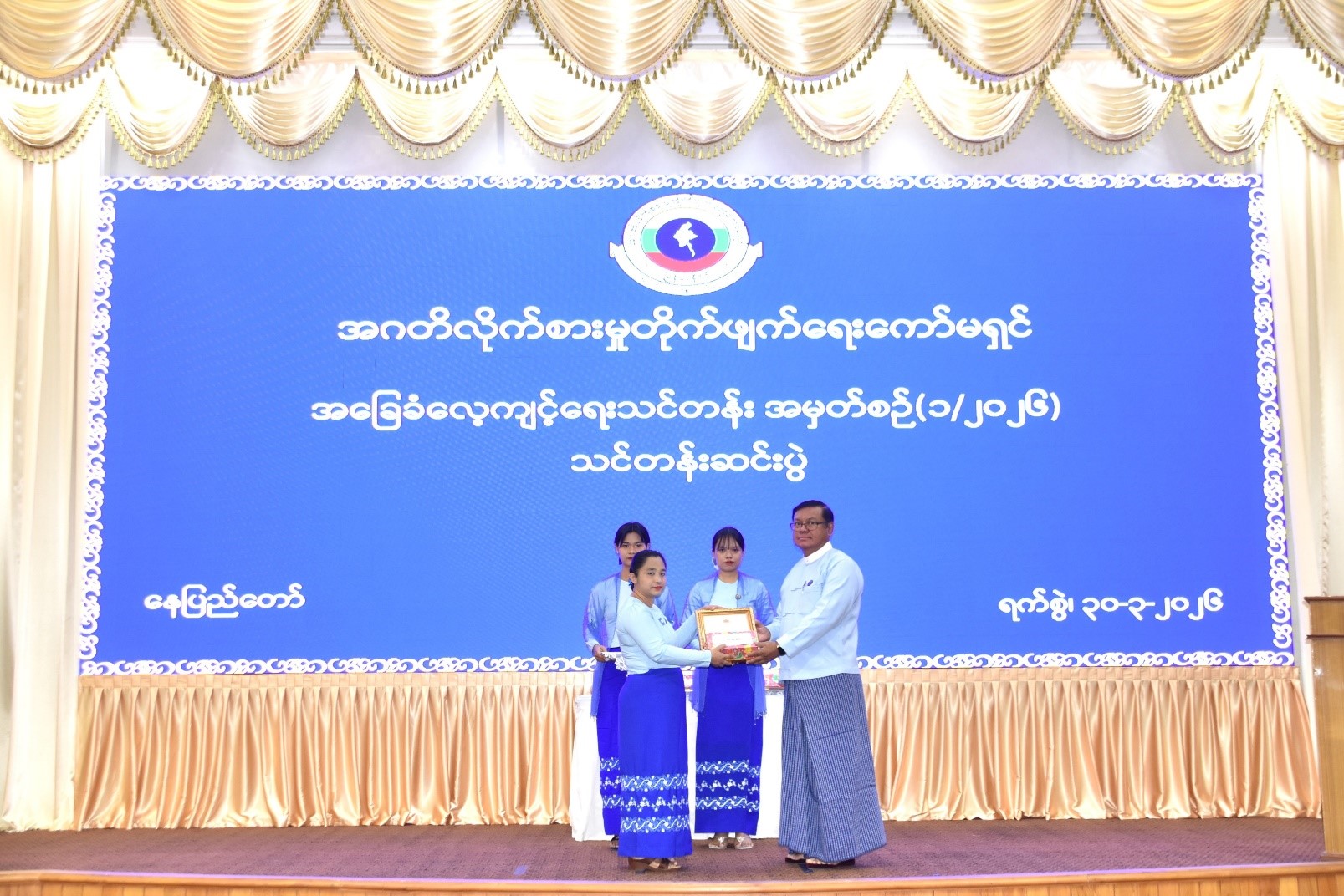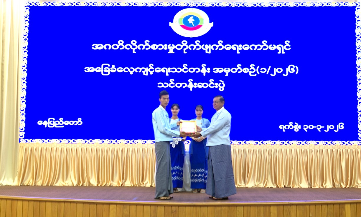 ကော်မရှင်အဖွဲ့ဝင် ဦးကျော်ဝင်းသိန်းက ပထမဆုရရှိသည့် သင်တန်းသူတစ်ဦးအား ဂုဏ်ပြုမှတ်တမ်းလွှာ ချီးမြှင့်ပေးအပ်ခြင်း