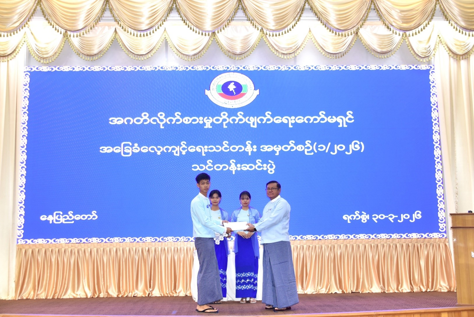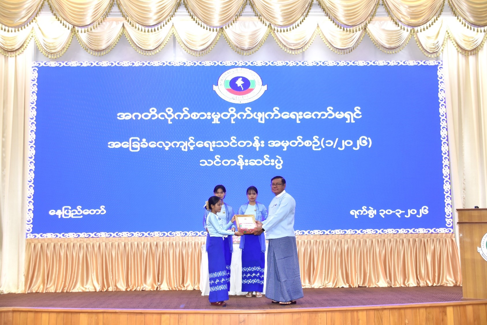 ကော်မရှင်အဖွဲ့ဝင် ဦးကျော်ဝင်းသိန်းက ဒုတိယဆုရရှိသည့် သင်တန်းသူတစ်ဦးအား ဂုဏ်ပြုမှတ်တမ်းလွှာ ချီးမြှင့်ပေးအပ်ခြင်း